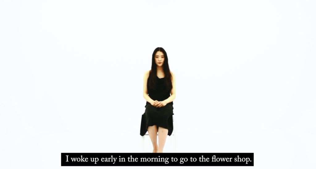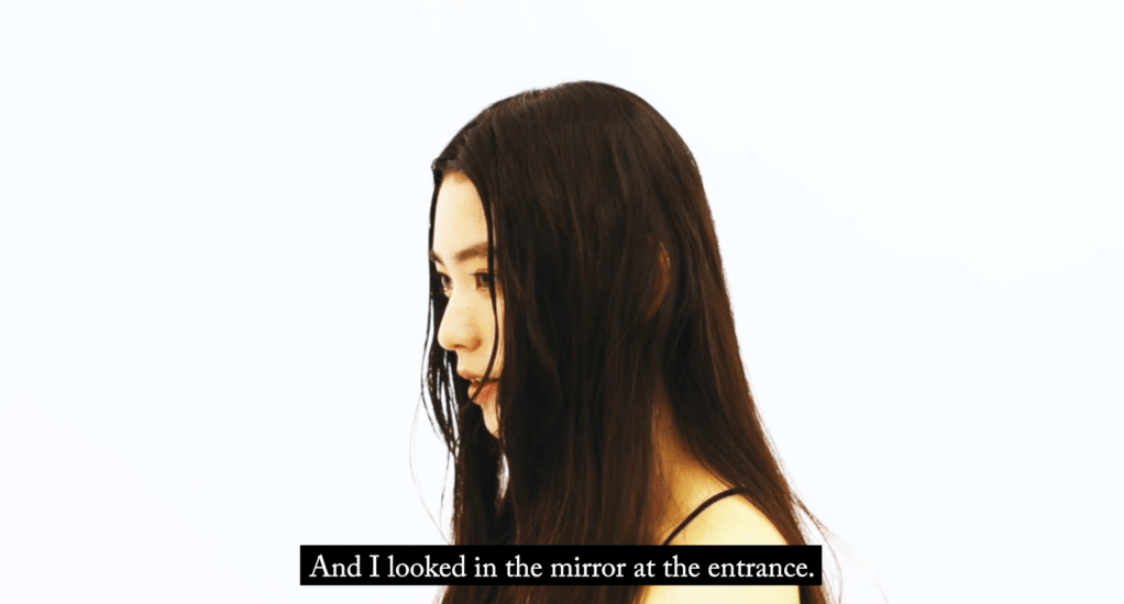 作中、彼女は、淡々と目の前にいる”誰か”に最近あった出来事を話す。内容は至ってなんでもない日常のようにも感じるが、真っ白な部屋が、まるで彼女の世界から色というものを消し去ってしまったかのように見えた。