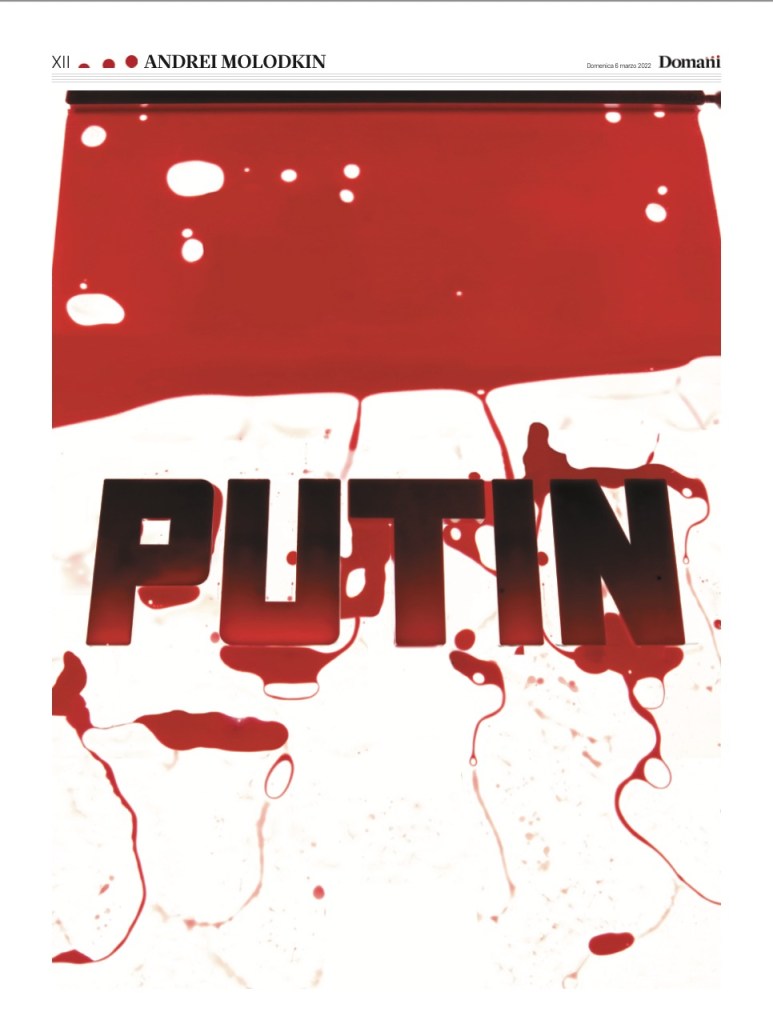2022年3月16日(水)、ロンドンにあるセント・ジョンズ教会にて、高さ約8メートルの巨大なプーチンの肖像画が突如として姿を現した。新作「PUTIN FILLED UKRAINIAN BLOOD」は、フランス在住のロシア人現代アーティスト・Andrei Molodkinがロシア軍によるウクライナ侵攻への抗議として制作したもので、作品に使用された血液は彼のウクライナ人の友人や同僚が戦いのために母国に戻る前に献血を行い作られたものである。献血した男性の妻や子どもたちは現在紛争地から逃れ、フランス・モーブルゲ地区にある「The Foundry」施設内の宿舎に住んでいる。