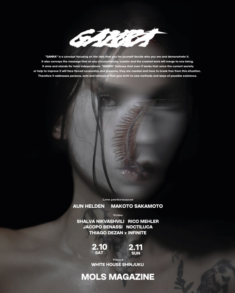 GANRA is a concept focusing on the idea that you for yourself decide who you are and demonstrate it. It also conveys the message that at any circumstances, creator and the created work will merge to one being. It aims and stands for total independence. “GANRA” believes that even if works that voice the current society or help to improve it will face forced censorship and pressure, they are needed and have to break free from this situation. Therefore it addresses persons, acts and behaviors that give birth to new methods and ways of possible existence.